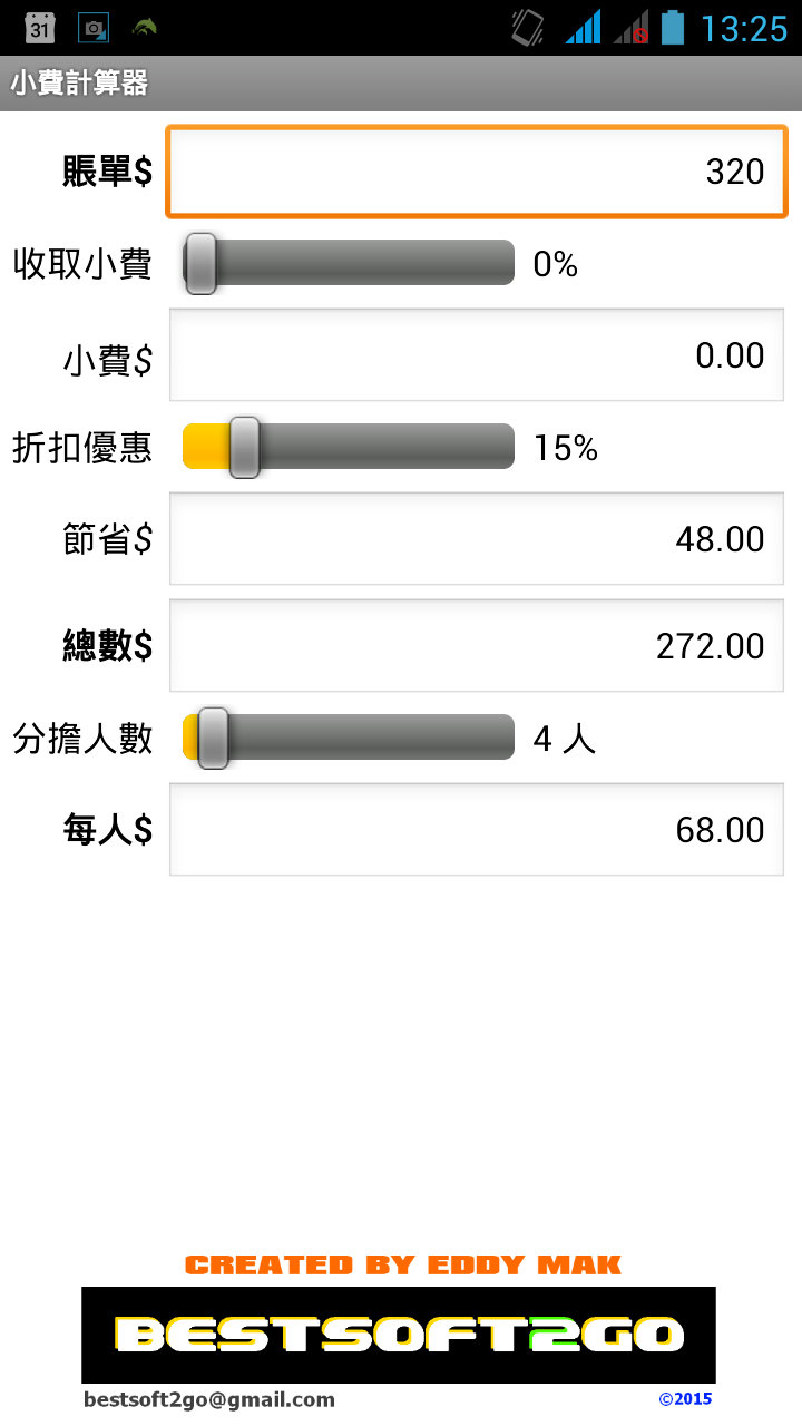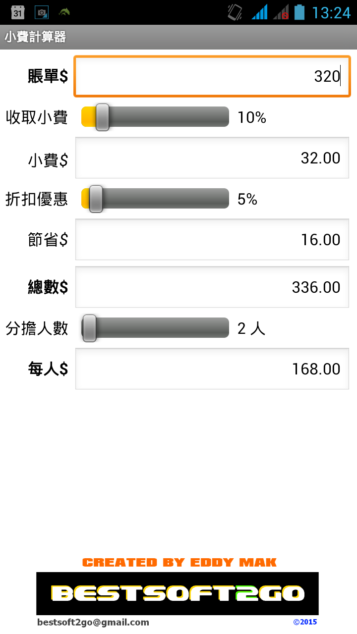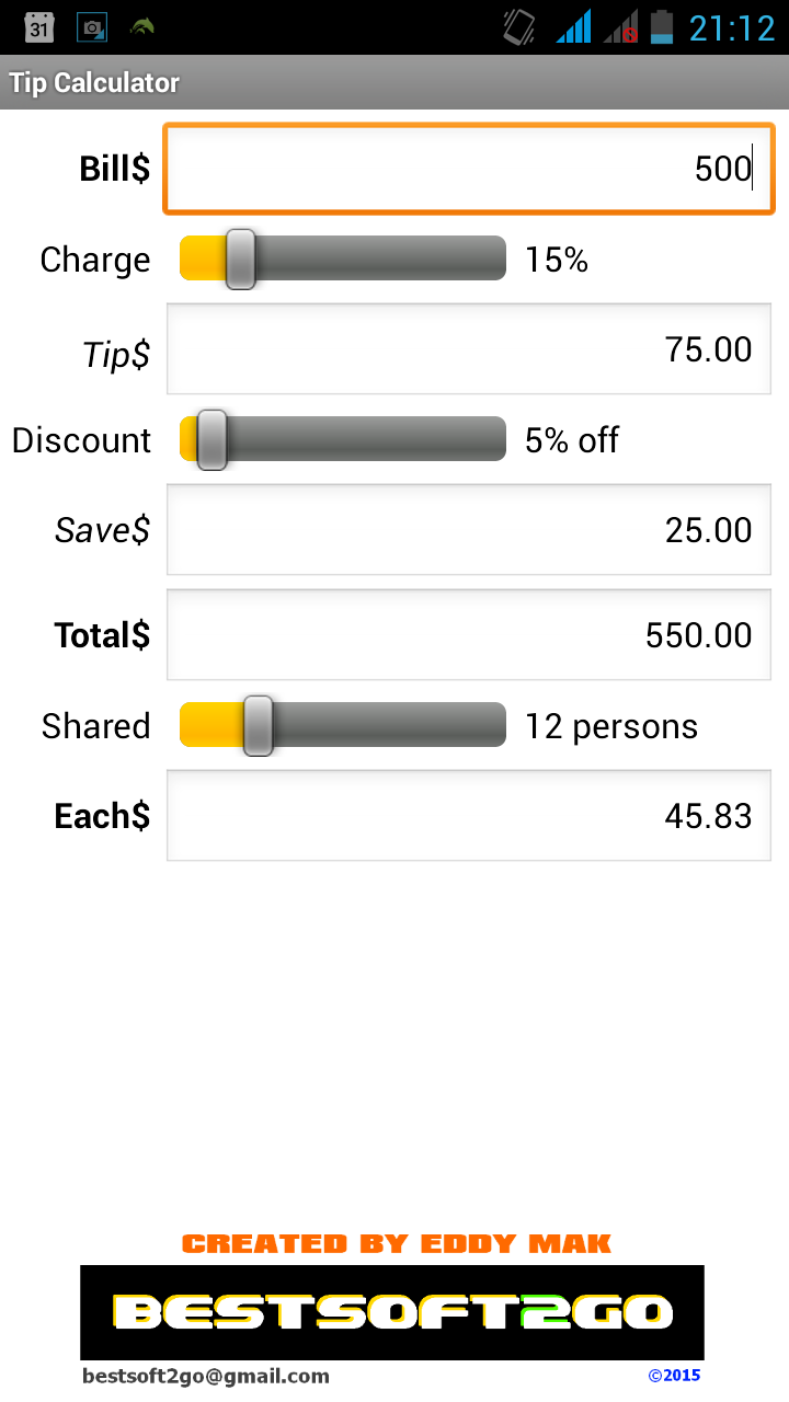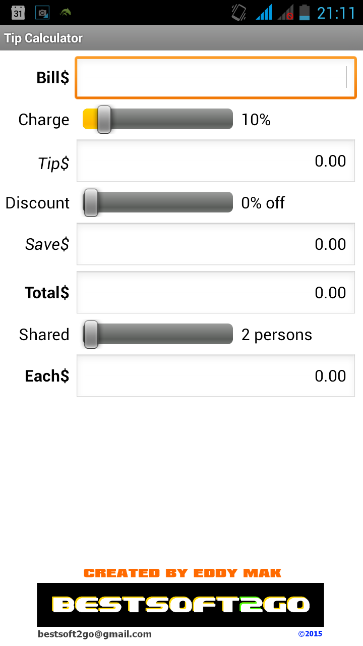 This practical tip calculator helps you easily calculate tip, discount and split the bill!This tip calculator app not only can quickly and easily calculate the tip and the discount but also easily split the bill.After you enter the amount on tip calculator, adjust the percentage of tip, the percentage of discount and the number of people to share, you ca
