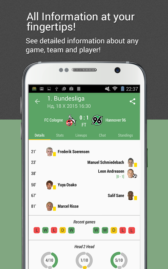 Worldwide live scores! Get immediate push notifications! Get first the latest Videos, Statistics, Standings, Fixtures, Top Scorers, Stats and Chat in beautiful easy to read layouts. All Goals is the premier football app and was the first Livescores football App in the Market! Create a profile and start following teams, players and other users. Detailed feature list: - Simple soccer / football live scores - UEFA EURO 2016™ fixtures - Game details, lineups, statistics, last results of teams,