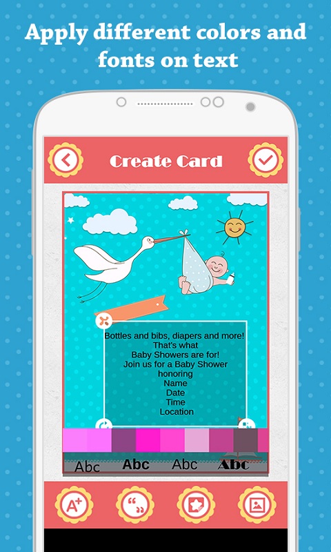 Invite all your family relatives and friends to the showering of the baby. Use this app to create some amazing cards to invite all the close ones into the baby showering day. Select any of your favorite card from lot of different beautiful options of card selection. Use variety of different editing features to make it look more attractive and beautiful. Features in the App: 1) Choose from many different card options to choose from. 2) Also create your own apps with many different background