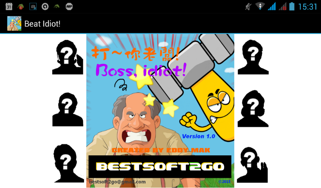 Beat Idiot!This is a simple game.If you are a worker... Do you hate your boss? Have you even thought to beat him/her up? In reality, no.. please stop!We know you are very angry. This little game is to help you release your anger. Imagine the bareheaded is the one you really hate. You freely hit his/her head! Play as much longer as you can. Feel better now?