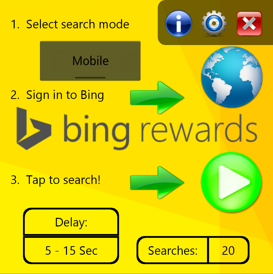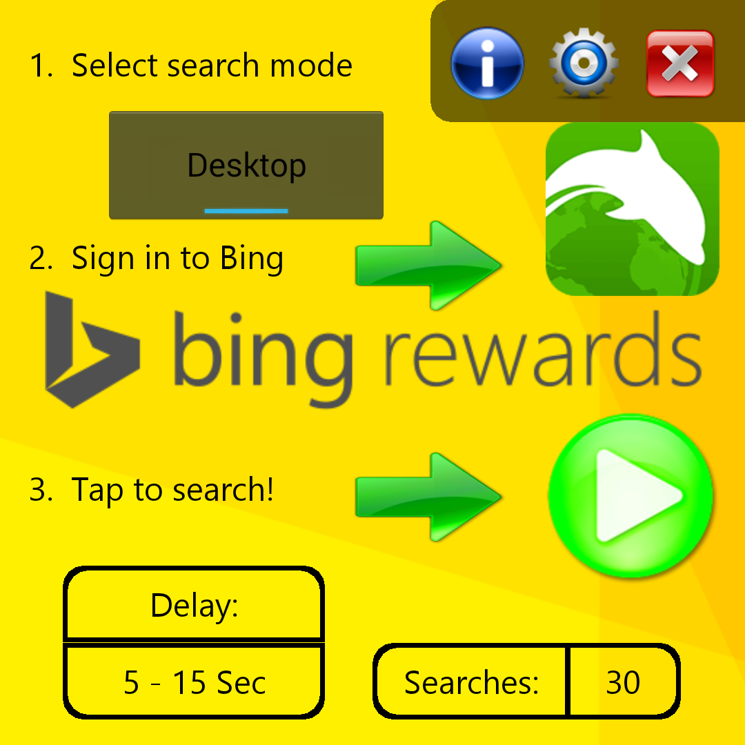 Search Bing automatically to earn your daily Bing rewards credits. Just specify mobile or desktop search mode and tap start!