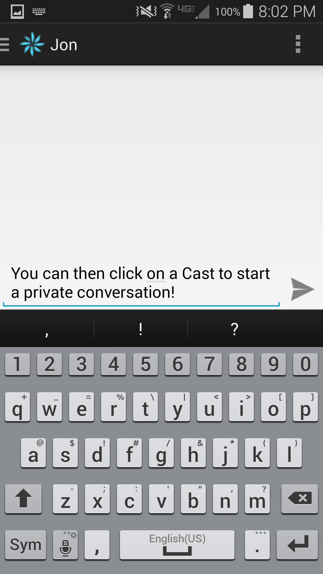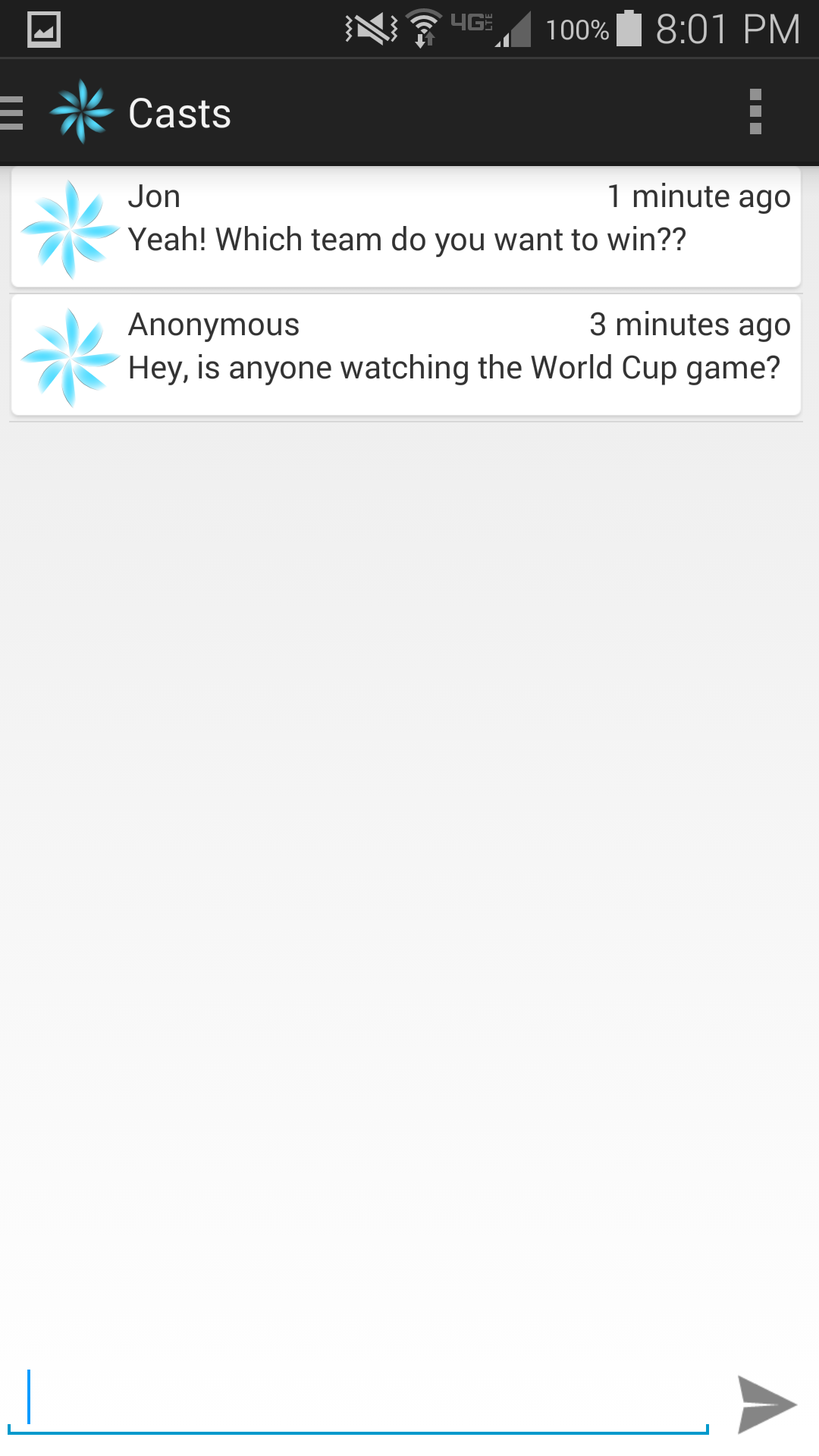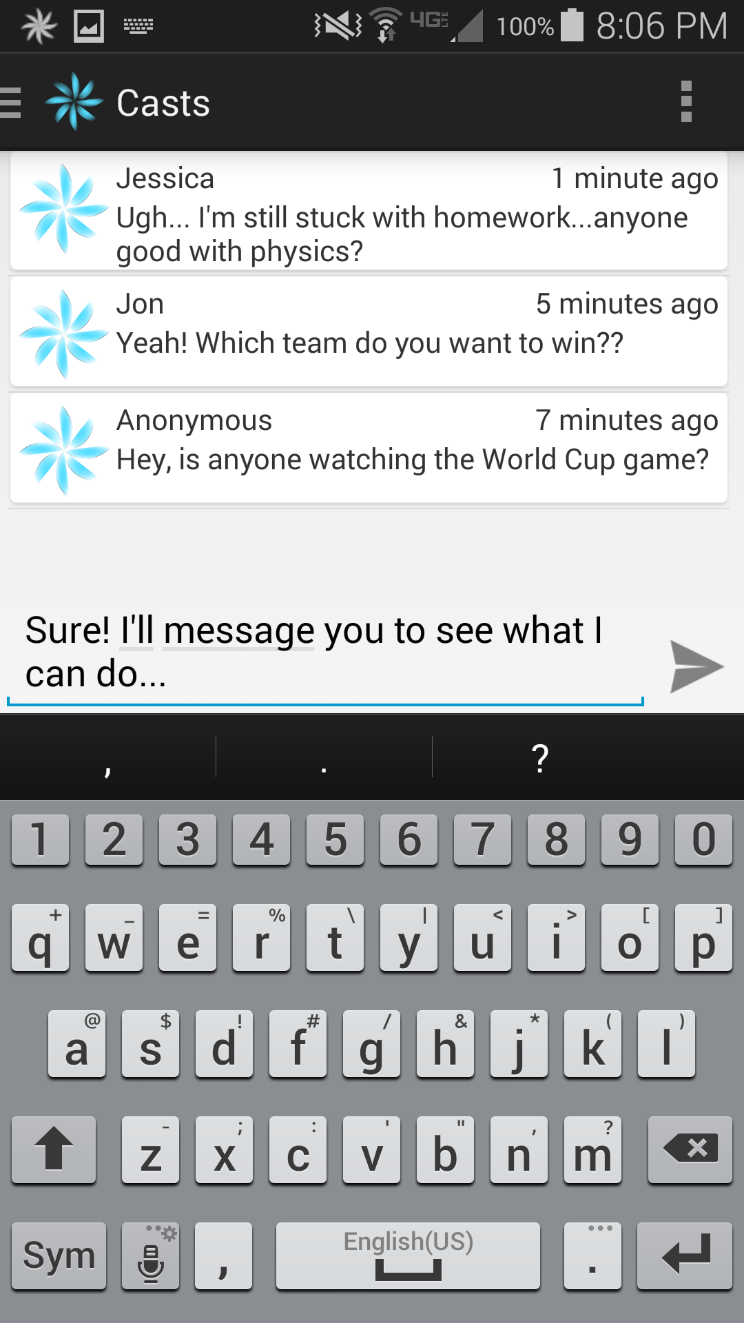CastChat lets you write a message and broadcast it to other users in your area (range of up to 20 km!). Other users will never know your exact location and you can change your display name at any time. There is no sign up, just download, install and start sending messages to your community. Whether you are supporting your local sports team, looking for classmates to study with, or just wanting to find new people to talk to, just Cast your message and see who in your area is interested. If you