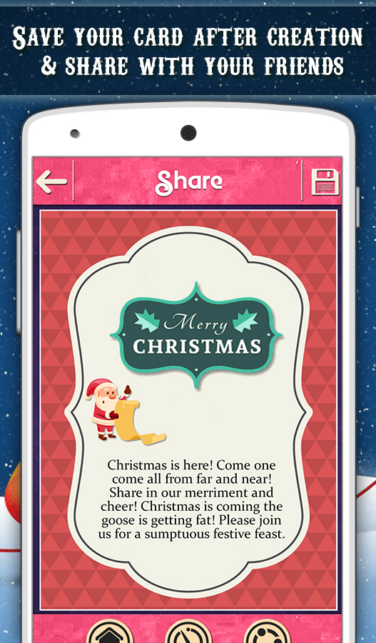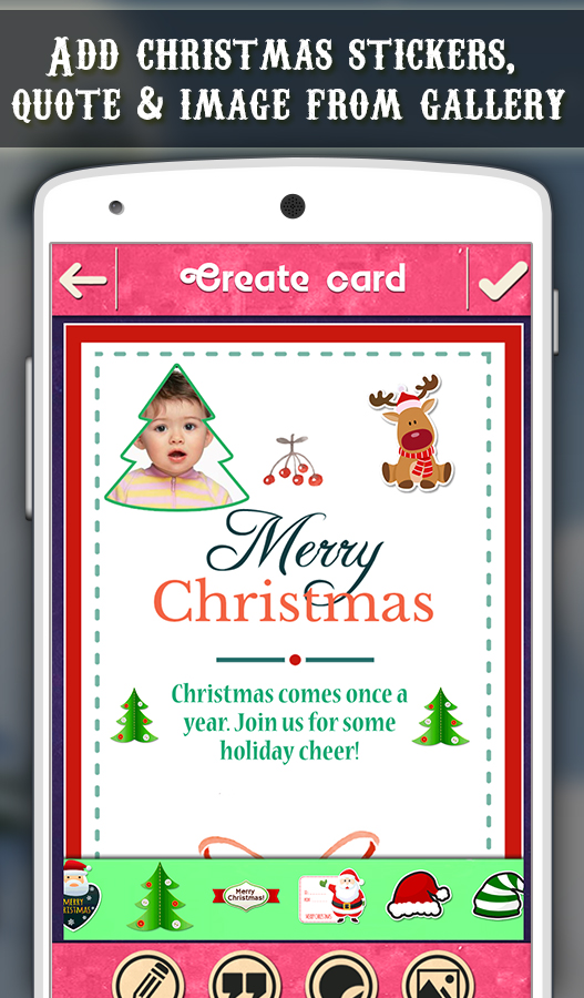Hello Friends, Let's Celebrate Christmas and make it special by customizing Christmas Invitation cards using our app. Invite your friends and family to enjoy the most wonderful time of the year together. This Christmas App has a special function to create beautiful photo frames for you as well. Select your favorite Christmas cards from lots of different options of card design. Then choose an invitation quote, and add so many other features like adding your favorite stickers, images from your gal