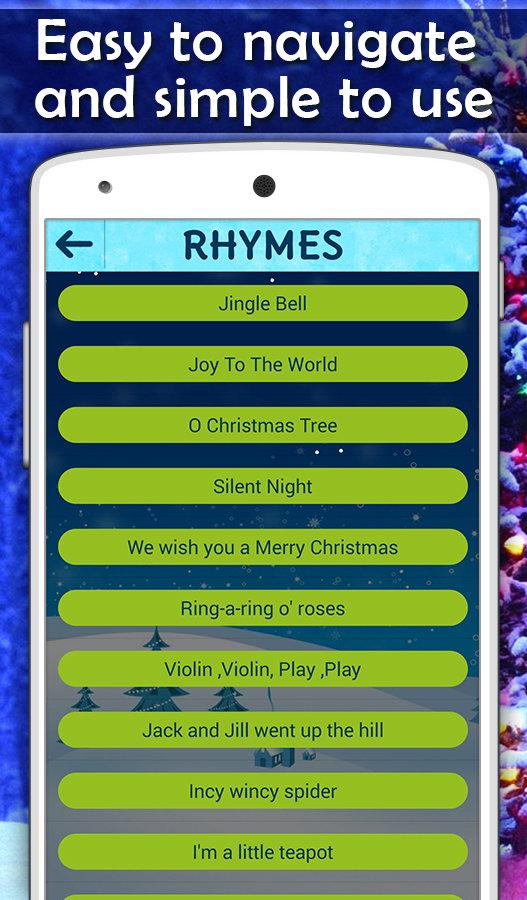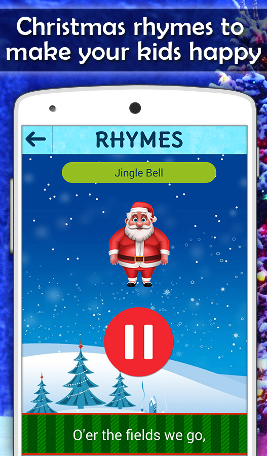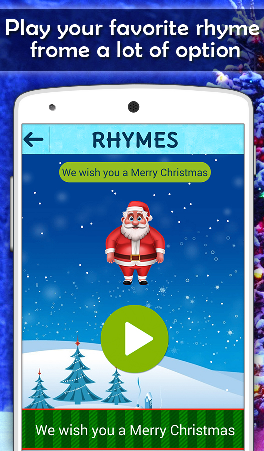 Its Christmas time and this is the perfect time to welcome Santa Claus. Christmas Rhymes app is intended to allow kids of all ages to sing some good favorite Christmas rhymes that set a mood for the winter holidays. In this Christmas app, we added kids friendly animated pictures and subtitles for each rhyme. You can enjoy lots of Christmas rhymes like Jingle Bell, Joy to the World, O Christmas Tree, Silent Night, We wish you Merry and much more. So don't waste the time download this cool app rig