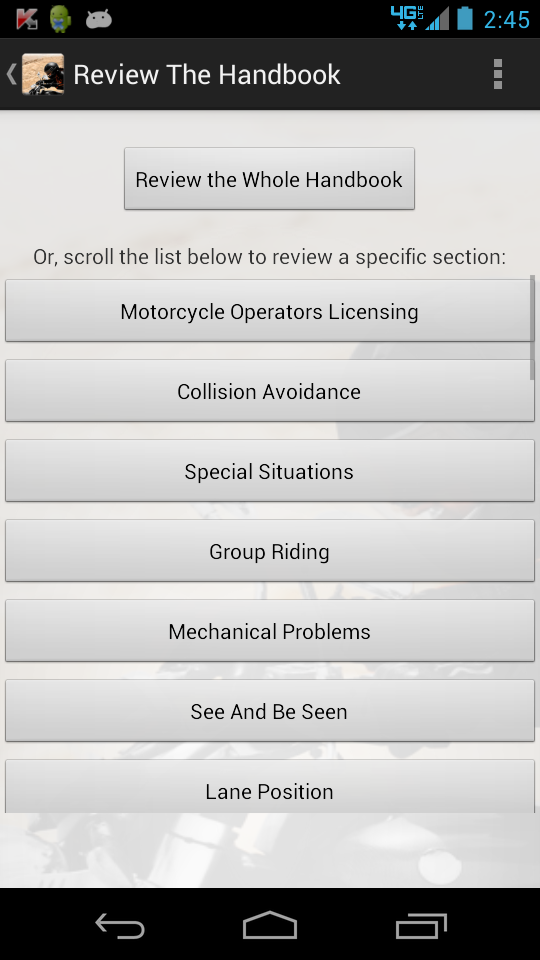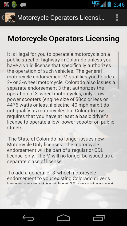 Don\'t settle for low resolution image scans of the official Colorado Motorcycle Operator\'s Handbook. This application allows you to study the handbook in a straight-forward, text-based format. Scroll through the entire handbook or choose one of sixteen sections, your choice.