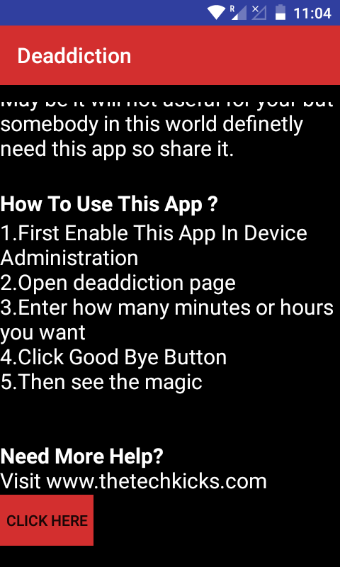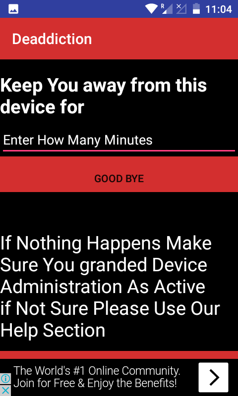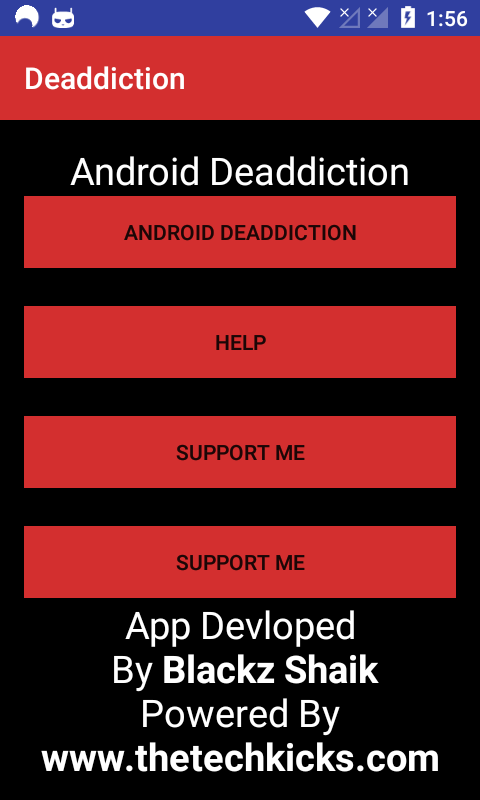 An android application that will stop you from using your own android device , Because people nowadays are too much addicted to android phones they dont even talk to the people nearby them if you are kinda person then this app is just specially made for you. Android deaddiction is an app that will keep you under control of not being addicted to android smart phones.You may want to conentrate on your daily life activites, but sometimes your phone may be your first enemy to not to do anythin
