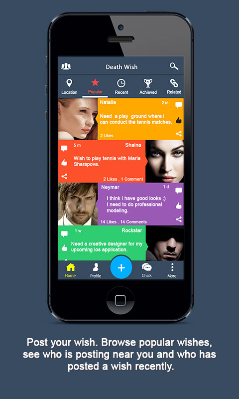 Dream. Share. Meet. Collaborate. DeathWish is a social network to share your dreams and passions and finding people around you who share the same dreams or can help you achieve that dream. Ask help from people near you.Meet people with similar interests as you. Make new friends. Collaborate on projects and ideas and fulfill your dreams. There is this one thing that you want to do before you die. It can be anything. A trip to Rome or spending your life with that one girl or saying “I lov