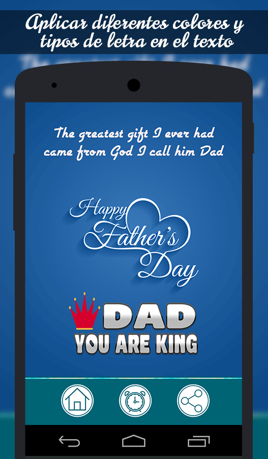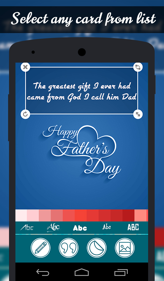 It is high time that we start making cards and share with all our friends and family on Father’s Day which is just few days away. So start making the best designed cards. Select your favorite Father’s Day card from a huge collection of options that you have in this app. Choose any of the Father’s Day related quote form the given set of options or you can also add any quote of your own to it. There are lots of other features to make the card look extra-ordinary and much more beautiful. Feature