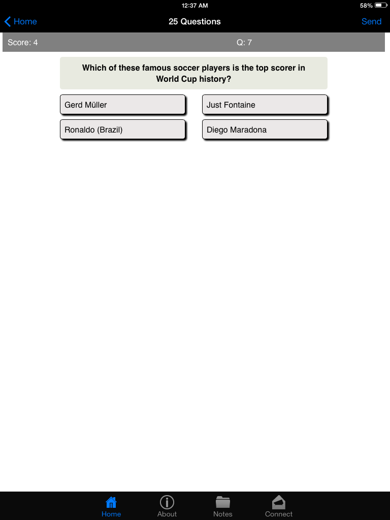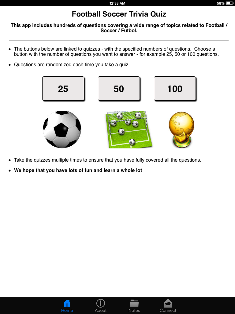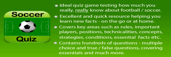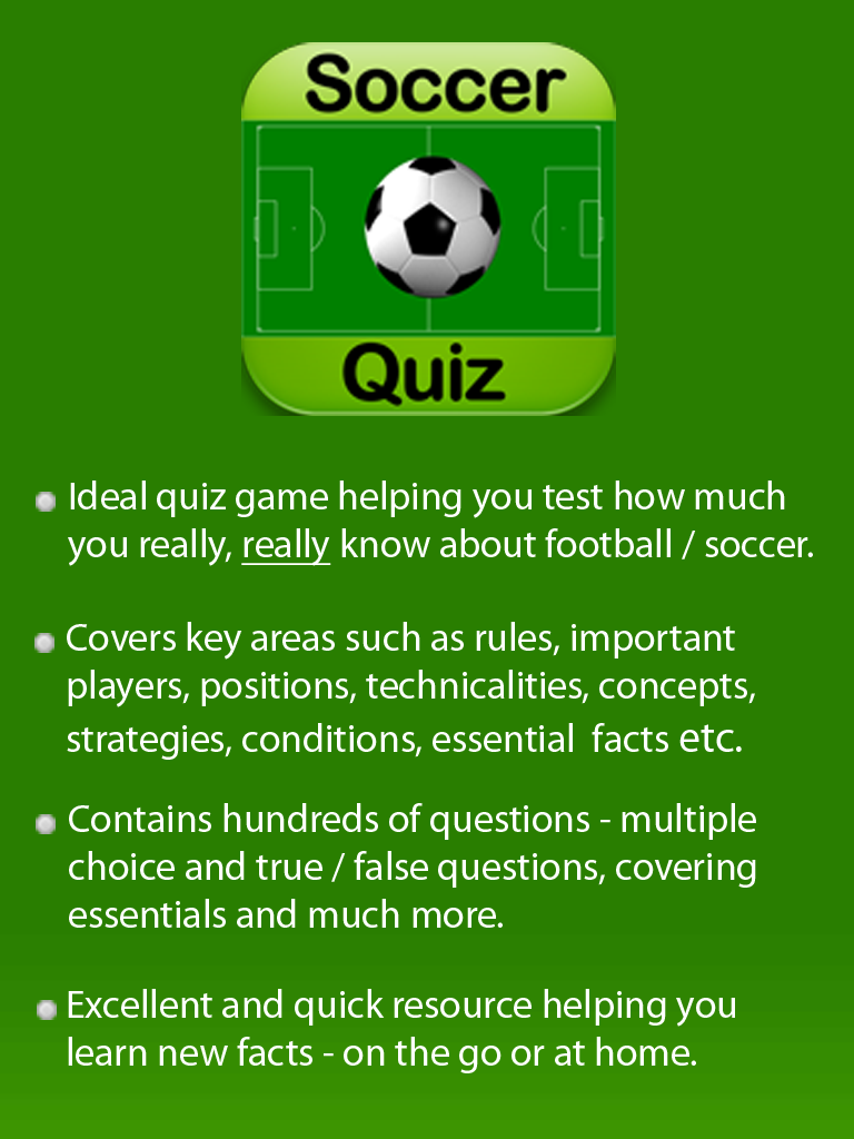Soccer: Its the world's most popular game and this quiz game will help you test how much you really, really know about this game. How well do you know soccer? Are you familiar with the rules, important players, position, technicalities, strategies, conditions, concepts, key soccer facts etc? Do you really know a lot about soccer? For real? If you want to prove your skills and find out how much you really know - then this is the best app for you! This app helps you test if you have a brain