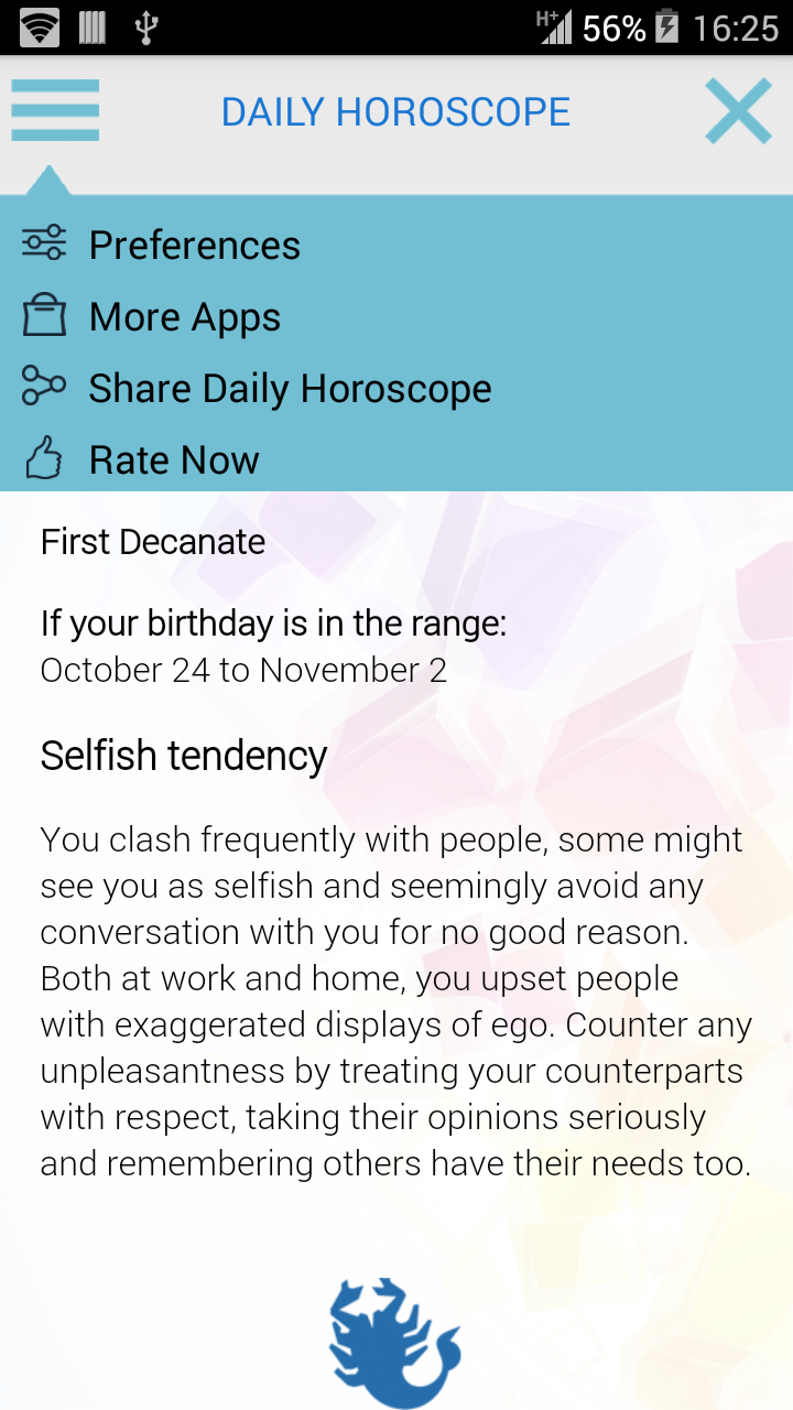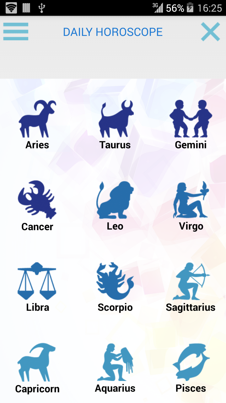 With daily horoscope free newspapers need not consult or seek specific section on the websites, here we show Zodiac sign for your daily horoscope. - You can consult future predictions of up to a week in advance and that of the day before. - See all Horoscopes Aries, Taurus, Gémminis, Cancer, Leo, Virgo, Libra, Scorpio, Sagittarius, Aquarius, Pisces. - Share predicting with any application, social network or save the text to the clipboard. - You can also change the language of the app