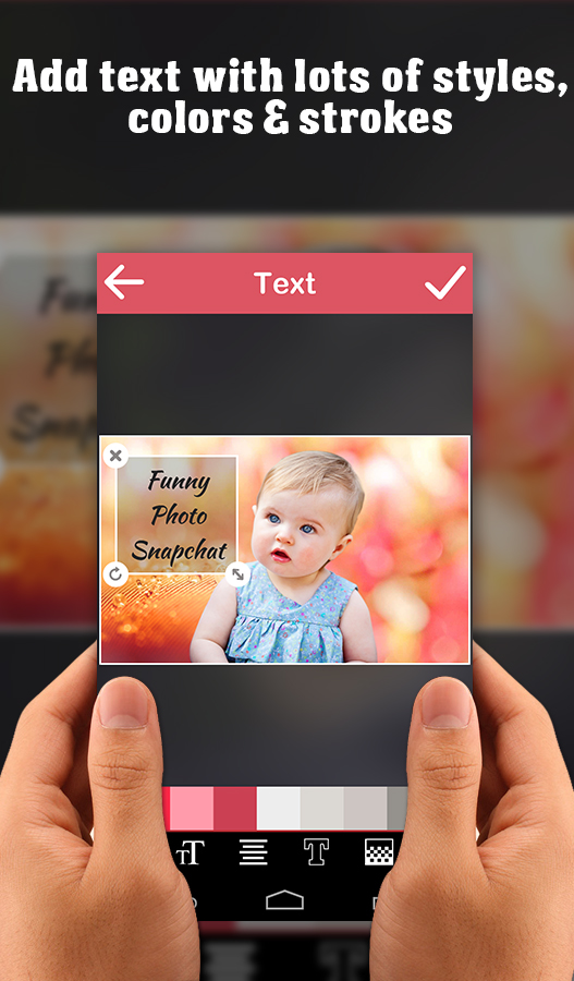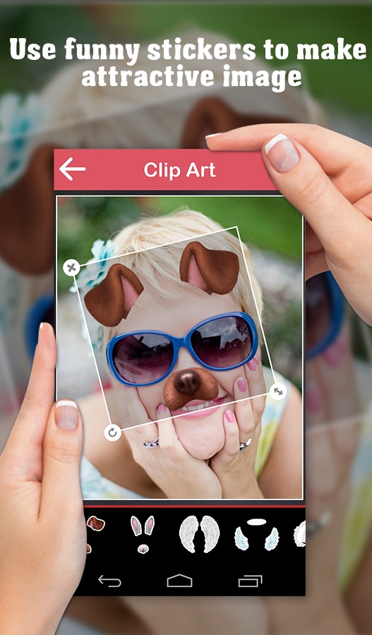 Funny Selfie Photo Snapchat is specially designed for making funny pictures. With this app you can put your photo into another photo with special effects as you want. Let's creative, funny smiley filters, clip art and text to your selfie photo. First, choose any photo from your phone gallery or take an awesome selfie with a camera. Then write texts to your photo using different fonts. Add clip art and filter to your snap, we have added lots of clip art for you like doggy eyes, cute rabbit ears a