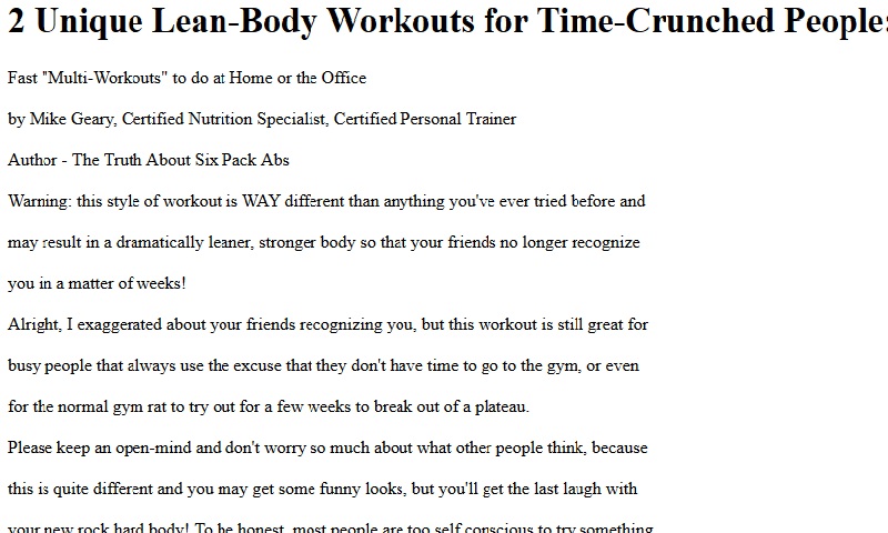 You’re going to find various powerful strategies to make your training and nutrition program more exciting and result producing for lean body. You’ll find out the truth about cardio. You’ll discover some extremely effective strength training exercises, tips, and strategies. You’ll even discover some new training styles that have emerged in recent years as well as some fresh ideas you’ve probably never thought of before. I’ll also give you some great healthy meal ideas and unbiased nutritional st