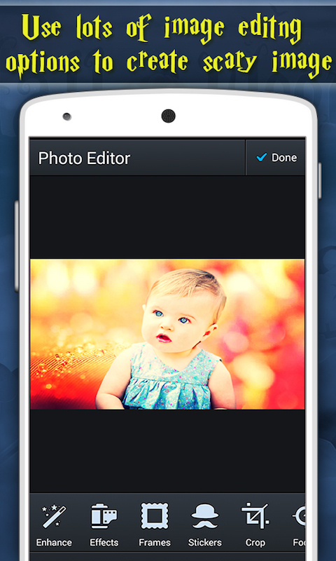 If you need some scary photo for this upcoming Halloween then "Halloween Face Editor and Montage" is a perfect application for you. This app allows you to create amazing photo montages with your favorite pictures. First, select images from photo gallery, or take a new one by the camera, and start with photo editing. Suit your face into some scary Halloween photo frame and take a photo directly. Halloween Face Editor and Montage will give to your photos new incredible looking. This "fun app" incl