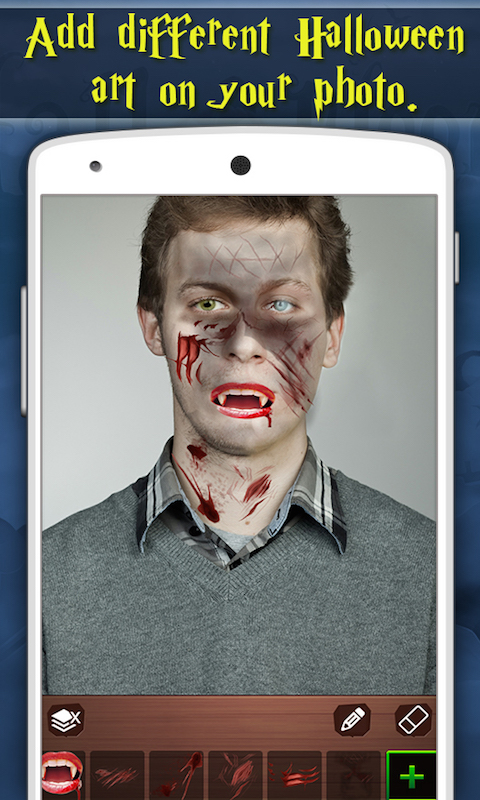 Halloween night is just around the corner, do you want to make your pictures cool by decorating with delicate and funny arts? If yes, Halloween Photo Of You has already been prepared for you. First of all take a photo or choose from the mobile gallery and add your favorite art to decorate it. Here in this app, we added the tons of different character arts for you, like pumpkins, ghosts, vamp teeth, zombie and much more. You can also edit a photo with an advanced editor for added effect, text, ro