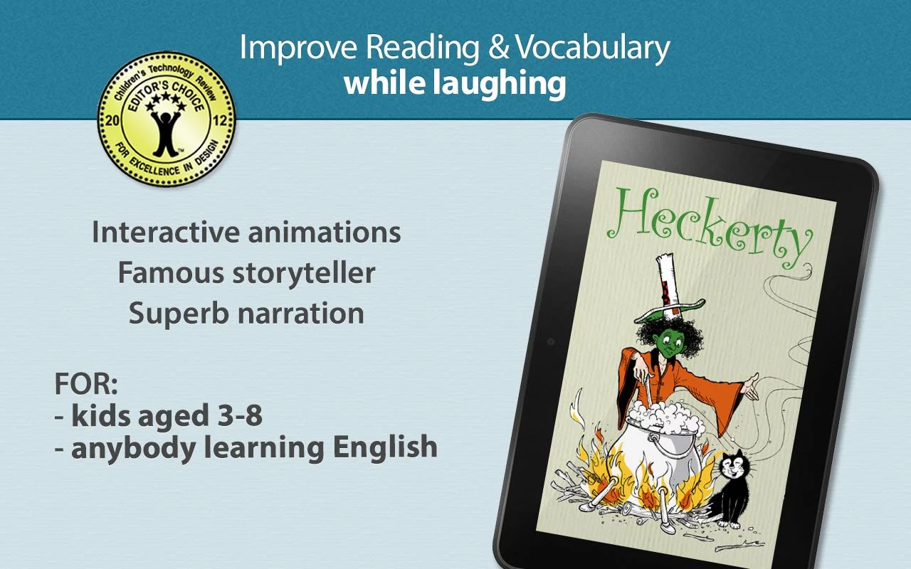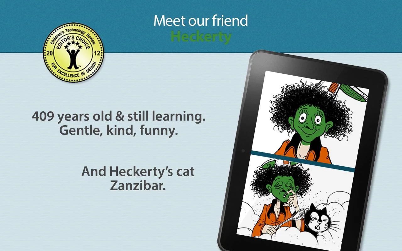 A funny family storybook for learning to read English Do you think learning can be funny? Would you like to laugh while you learn English? Meet our award-winning friend Heckerty — a 409 year old green-faced witch, hilarious and with a heart of gold. An Editor’s Choice by Children’s Technology Review, “Recommended by Educators” on Google Play for Education, awarded 4 Stars by CommonSense.org, Shorty Awards finalist, a Mashable Kids Pick and proclaimed a “must have” by The Unofficial Apple Web