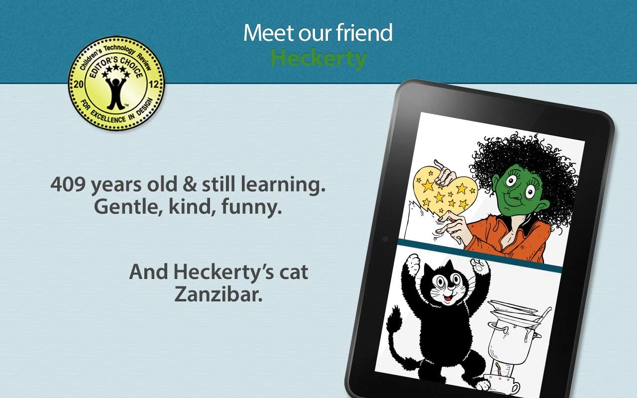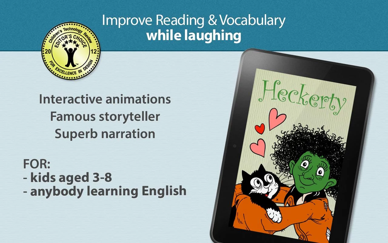 A funny family storybook for learning to read English Do you think learning can be funny? Would you like to laugh while you learn English? Meet our award-winning friend Heckerty — a 409 year old green-faced witch, hilarious and with a heart of gold. An Editor’s Choice by Children’s Technology Review, “Recommended by Educators” on Google Play for Education, awarded 4 Stars by CommonSense.org, Shorty Awards finalist, a Mashable Kids Pick and proclaimed a “must have” by The Unofficial Apple Web