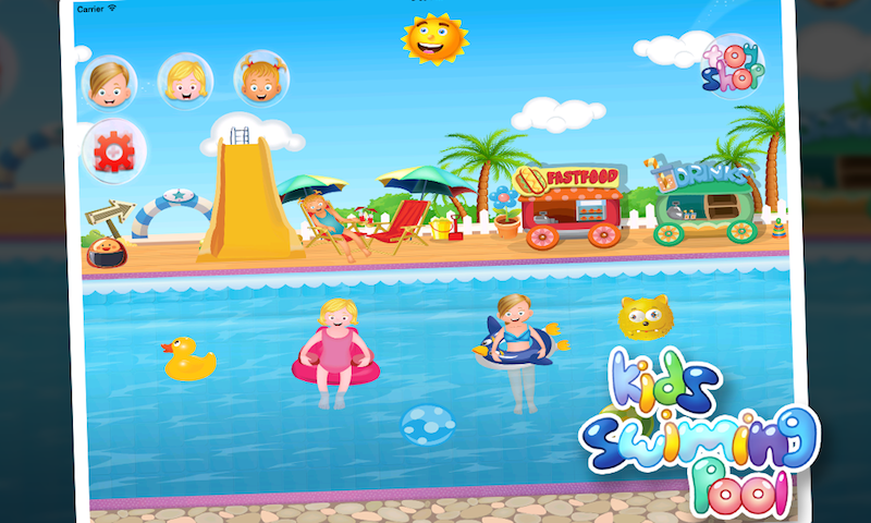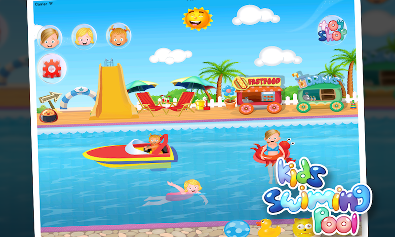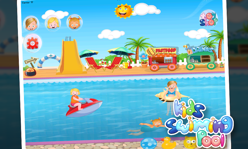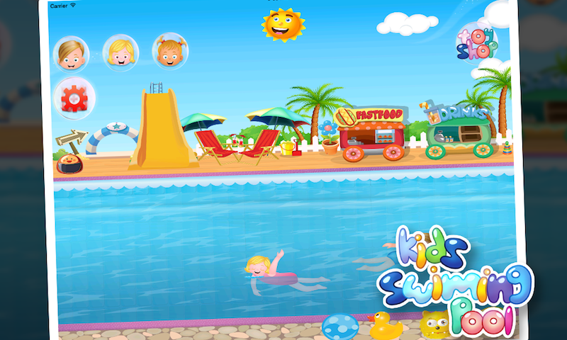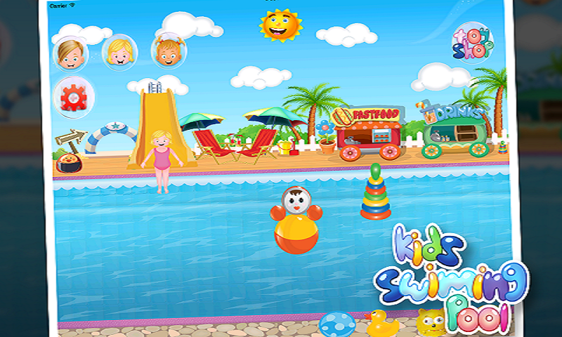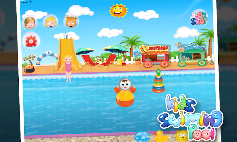 the swimming pool is a game for girls that contains the following functionality: - swimming the kids - eating food which is liked by kids - cold drinks
