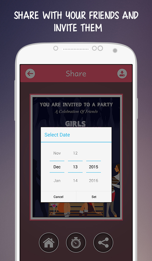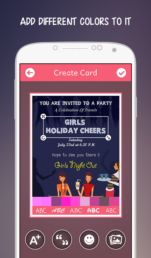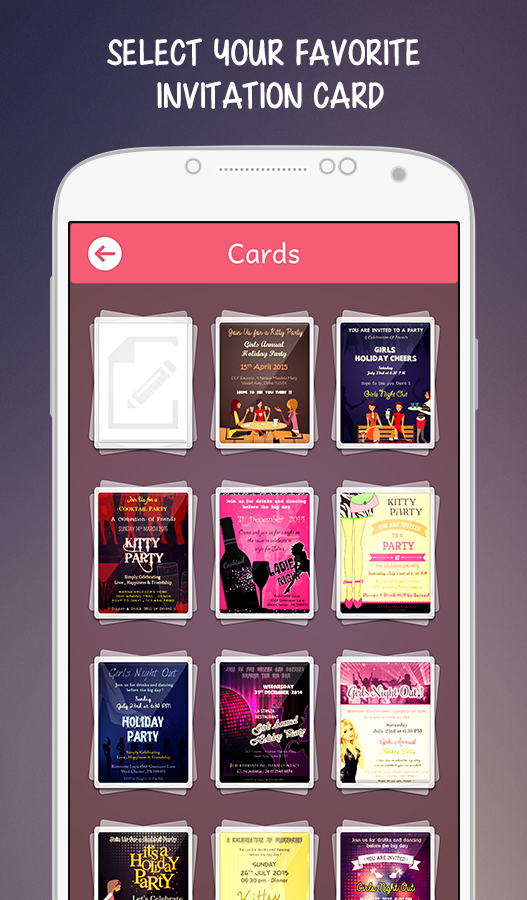 Invite all your friends to your fun filled Kitty party not by a simple message on whatsapp or facebook but sending them a beautiful and attractive invitation card. Choose from a wide variety of eye catching invitation cards along with a beautiful quote written on it. Add your favorite image on the invitation card which cherishes your old memories with your friends. Also create invitation cards by yourselves with some interesting effects, images, quotes and many more addition to it. Features: