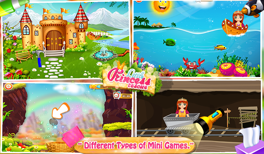 Welcome to princess world, Join in the exciting mission to rescue little princess. Little princess rescue kids game arrived here. Six different fun filled activities included inside the game, as you care of little princess.