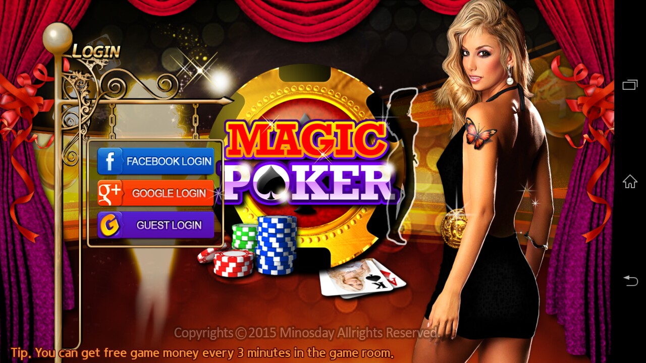 Magic-Poker! It is classical Texas Hold'em card game! Play, compete, learn and win anytime and wherever you want! Don't forget to invite friends from google & face book, to see who is a poker player in our Free Poker. Do you love Texas poker? Do you want to play with real people whenever and wherever you want from your android devices? Magic Poker can help you! The only thing you need is your phone or tablet and internet connection! Magic Poker offers beautiful graphics, custom avata