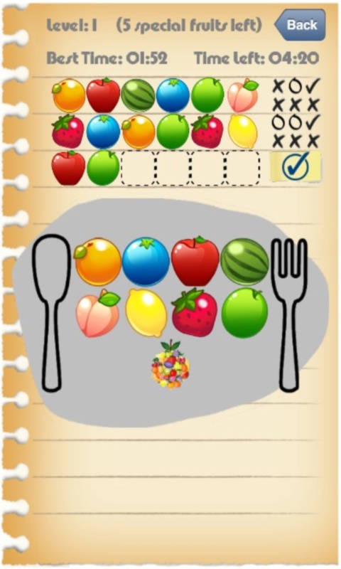 A code-breaking game - your master asked you, as a fruit chef, to make a bowl of salad for him. However, you are not told which fruits he wants and the sequence of mixing the fruits. You need to guess what he wants. You will have 12 chances. In each guess, you can choose 6 fruits from the fruit platter and the master gives some hints whether you are correct. A tick means you placed a correct fruit in correct sequence. A circle means you placed a correct fruit but not in