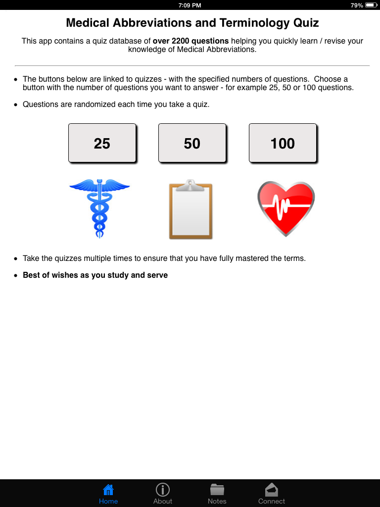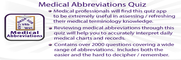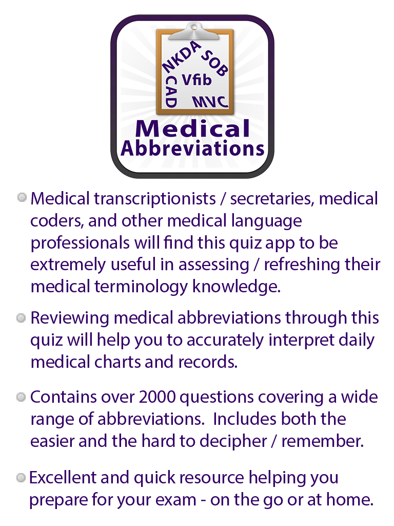 This app was set up to share knowledge and help you test and verify your knowledge of Medical Abbreviations and Terminology. It's a great way for you to revise and check what you have learned. As a medical professional, it is essential that you become very familiar with the abbreviations used in prescriptions, charts, medical notes dictated or written by physicians etc. In an ideal scenario, you should be able to quickly interpret or recognize an abbreviation. As a professional, you need t