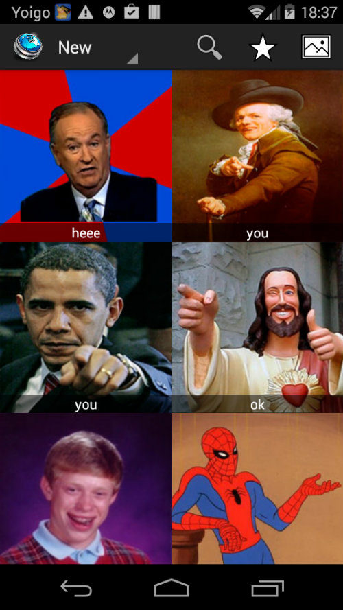 Meme Generator is a simple app. Browse the most popular memes on the internet, create your own meme and share them with your friends via Whatsapp, Facebook, Line, etc Do you want to create memes with photos from your gallery? You can do it. Select the text font, color and size and share the memes with your friends to joke ;) Thanks to this app you can: - Get images from different categories. - Use the large amount of popular memes on the internet. - Create memes with photos from you