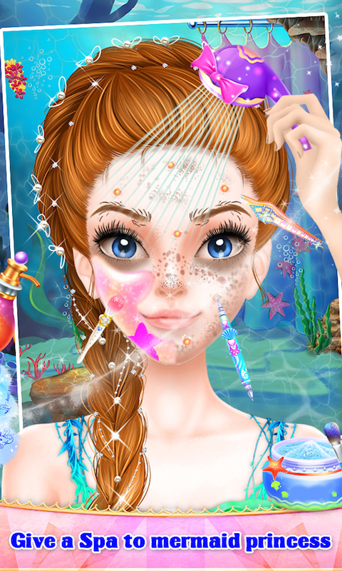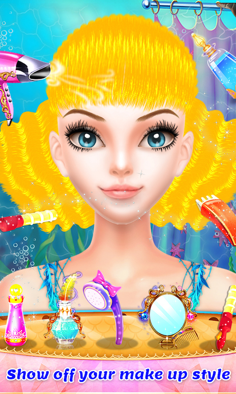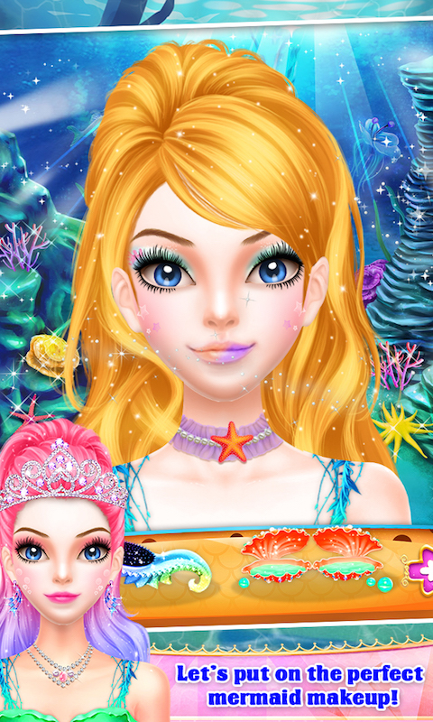 The beautiful mermaid is at the salon for the first time in her life. Help her with all the different makeover activities at your mermaid special salon. Start with the face makeover activities and use all the different cosmetics and creams. Make her face glow beautifully like a moon. Clean her hair with the shampoo and give different style to her hair. Do different hair designs and colors for her hair. Finally help her to choose the best and the most beautiful mermaid dress costume at your salon