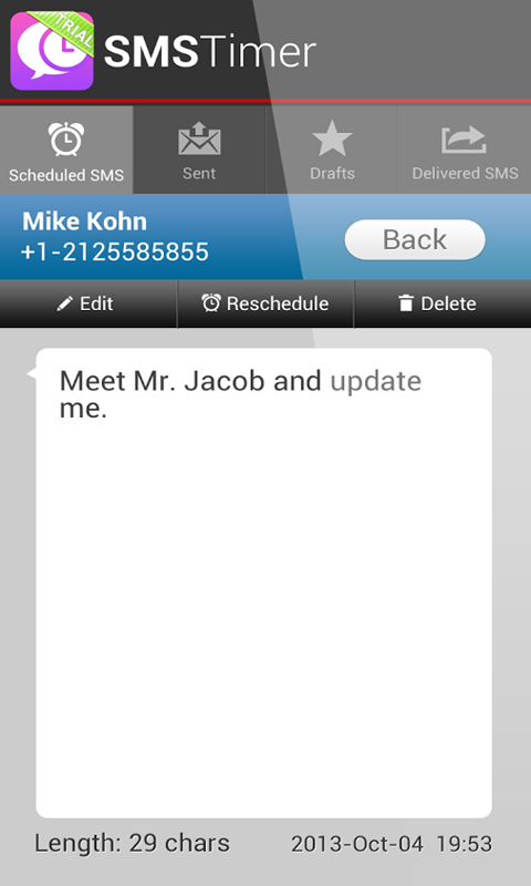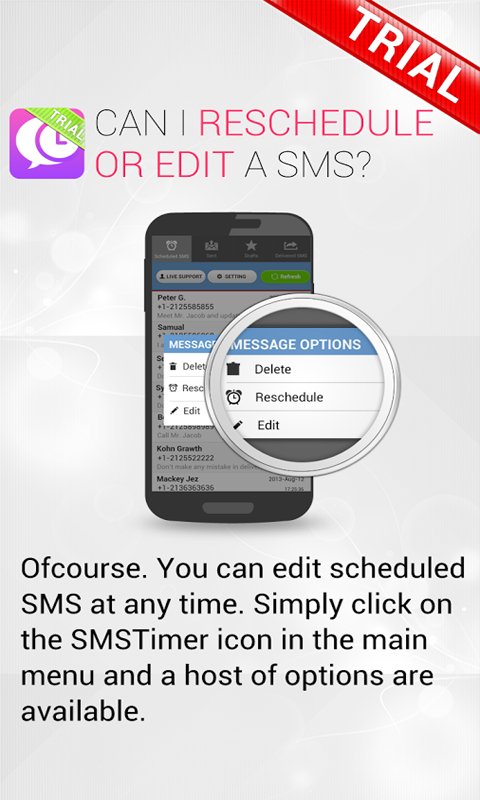 MobiMonster SMSTimer for Android enhance the power of your Native SMS application to sending Scheduled SMS .Simply create a SMS and click Send. SMSTimer springs into action and enables powerful scheduling.