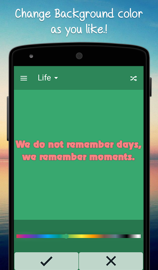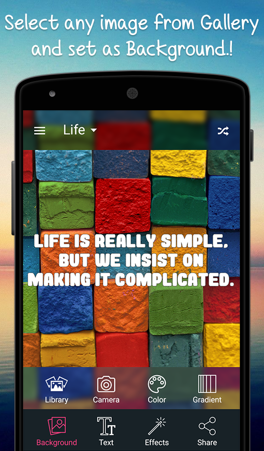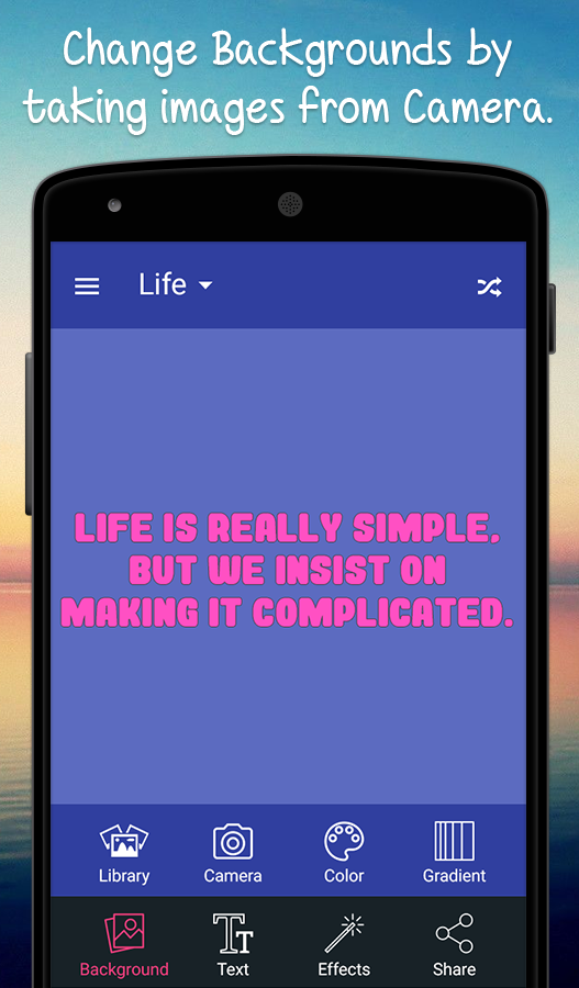 Enter into the world of beautiful and positive thought quotes. In this Quotes Creative Book app, you can create your quotes in the easiest way. Here we included 11 different categories quotes like life purpose, success, motivation, love, emotional, creative, humorous and much more. So create your quote with lots of customizing options such as background colors, text colors, text size, attractive fonts, filters and much more.