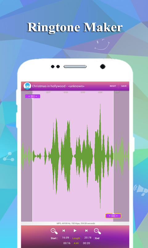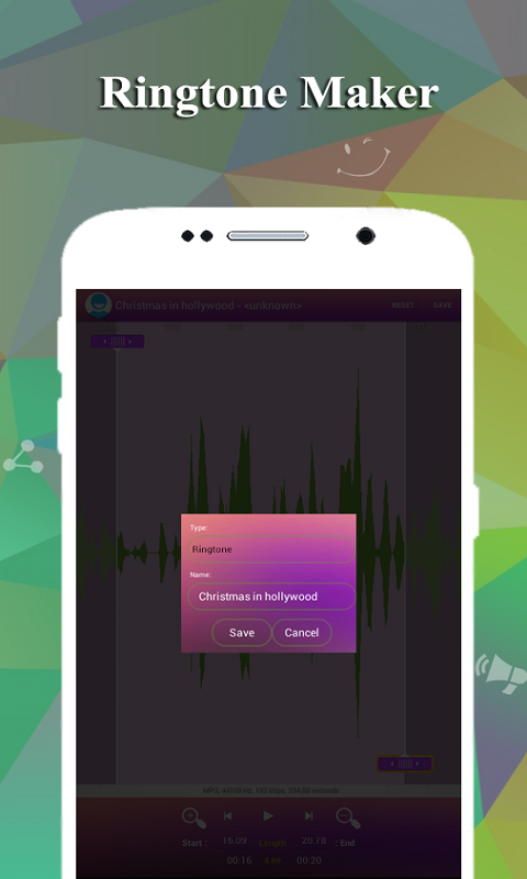 Cut the best part of your audio song and save it as your Ringtone/Alarm/Music File/Notification Tone. Make your own MP3 ringtones fast and easy with this app. How to use Ringtone Maker and Mp3 Cutter : 1.Select mp3/music from your mobile or from Recordings. 2.Select area to be chopped from your audio. 3.Save as Ringtone/Music/Alarm/Notification. App Features : ♪ Select and Edit Mp3/Music from your Mobile/SD. ♪ Option to delete (with confirmation alert) the created Tone. ♪ View a scrol
