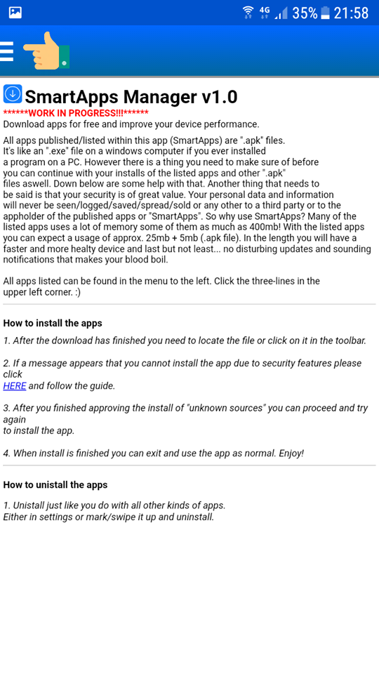 SmartApps is an library with improved apps of allready excisitng apps from Google play. This apps are designed for faster performance and usage of much less storage rather then the original ones. Enjoy :)