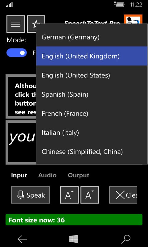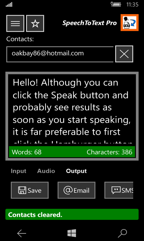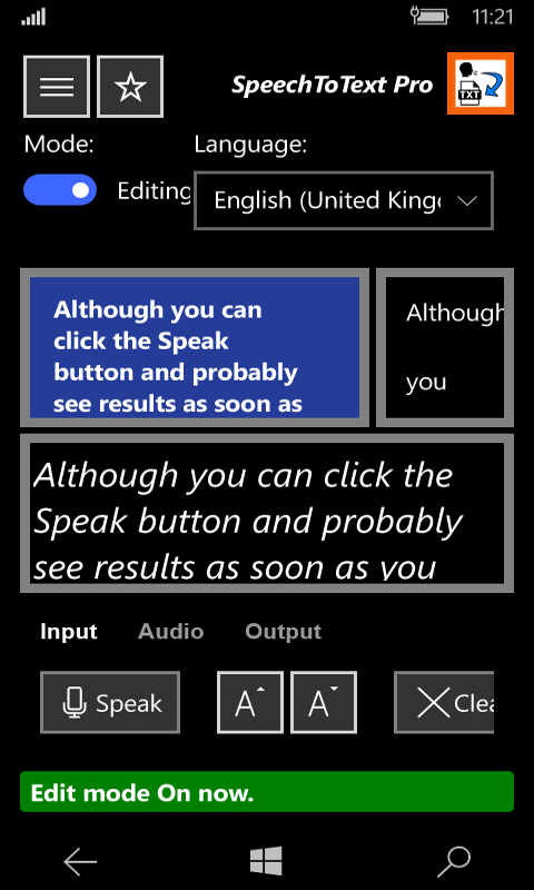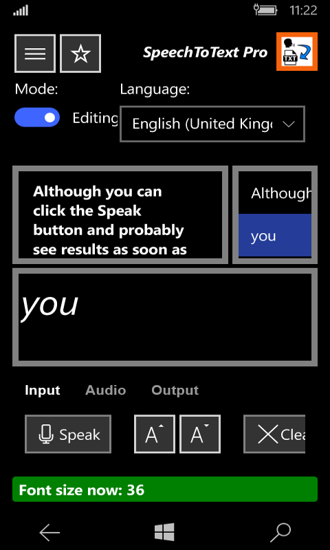SpeechToText Pro, for Windows 10 mobile and desktop, converts spoken words into text with near perfect accuracy. Because it is strong on editing, making corrections at the sentence or word level, is easy. Most of the words that a user can say in a supported language can be recognized, including proper nouns, and there is support for punctuation. Generated content can be saved to a file, sent as email, sent as SMS or played back at variable speeds using female or male synthetic voices. It is one
