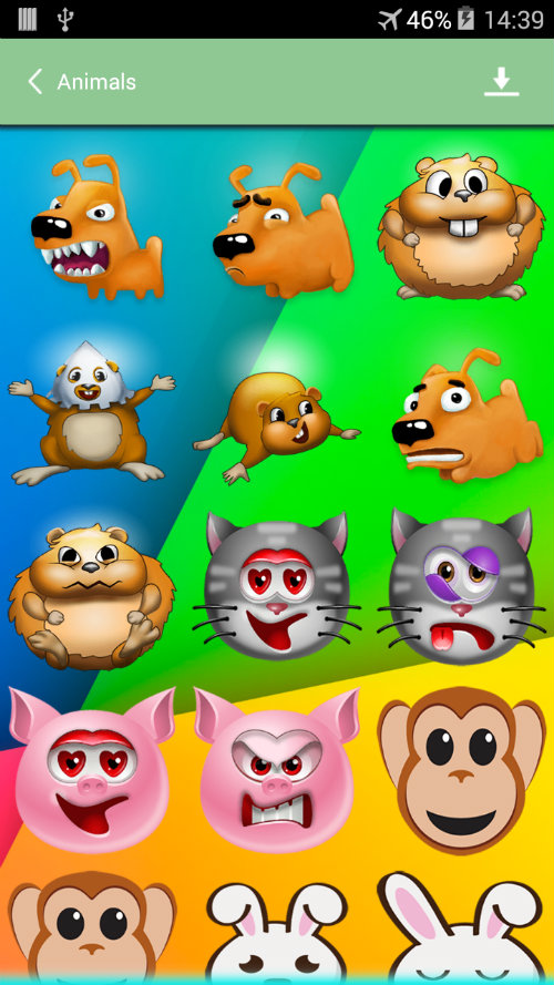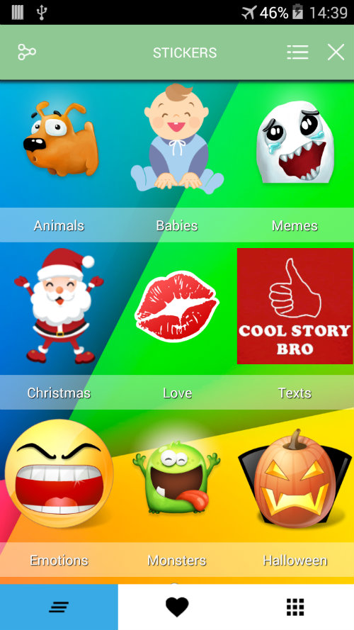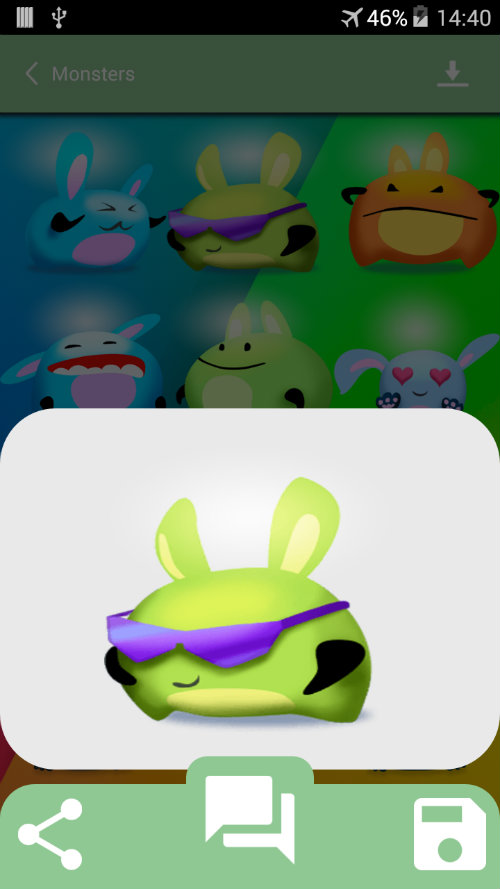 Stickers for chats, with this app you can share with friends all kinds of stickers in pictures of many categories for whatsapp chat and other services (facebook, google +, hangouts) format. Make your conversations more fun with stickers! You can choose to send sticker in any application on your phone, not just for whatsapp, also for any installed app. You can also: - Choose between different types of stickers as memes, animals, emoticons, smileys ... - Choose the applications you want sticke