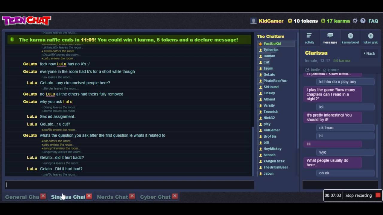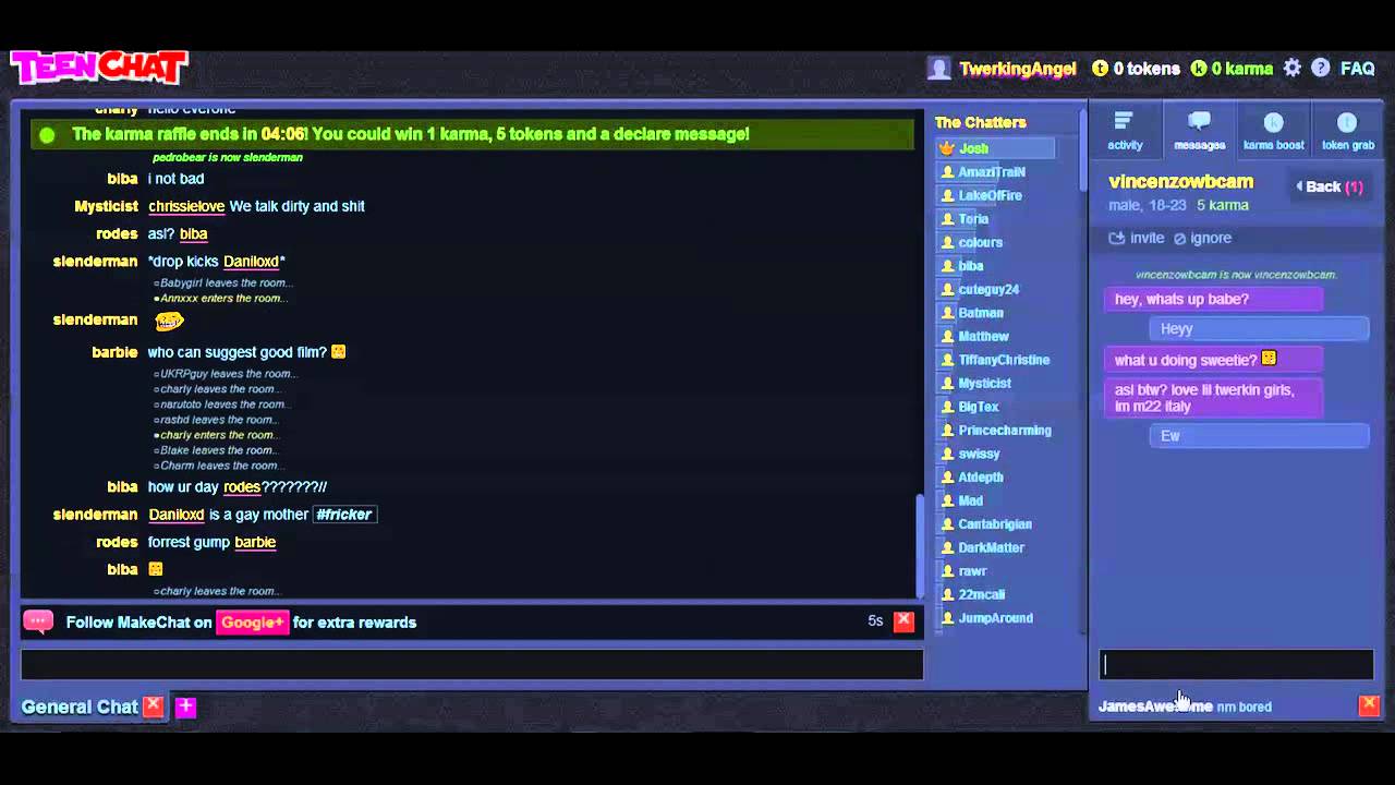 At TeenChat.com our mission is to being you the most innovative and fun chat experience on the web. You can read the rest of this page or you can take a few moments to log in and discover it for yourself. It's free and requires no registration to get started. TeenChat has an innovative karma system that improves upon the traditional chat experience by building in social incentives and extra capabilities to enhance the chat experience for valued members and to reduce the burden of chat room
