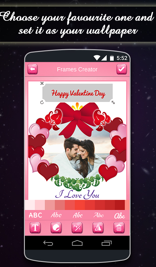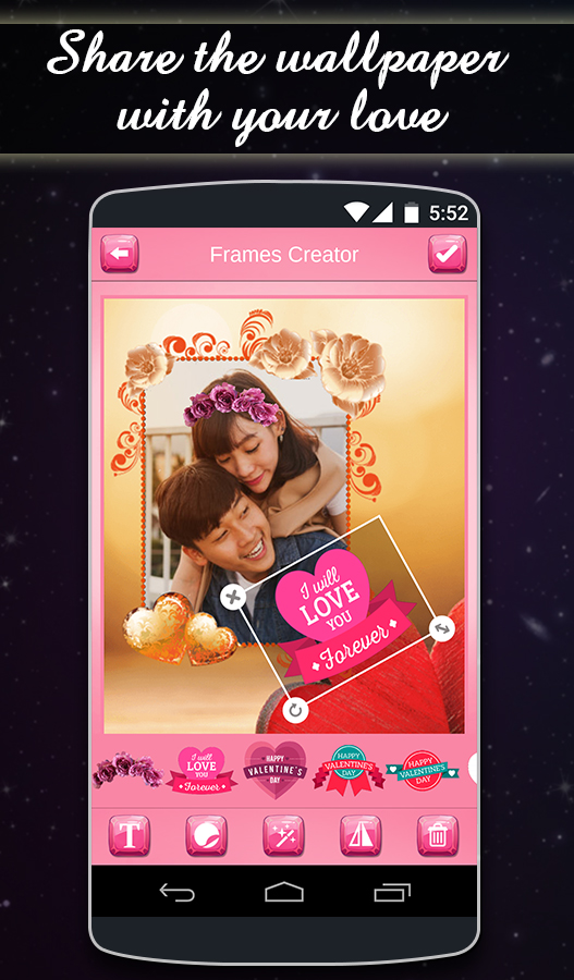 Valentine Day is the perfect time to express your feelings in a beautiful way with the love of your life. These special moments are always captured in photographs. Make these photographs more memorable with Valentine Photo Frames. First of all, Select a photo from the phone gallery or take a picture of yourself or your loved ones and choose your favorite valentine frame with beautiful colors. Then adjust position, size and brightness of your photo to the best. Add lovely text with a different st