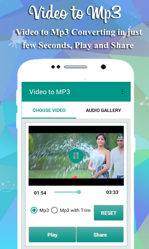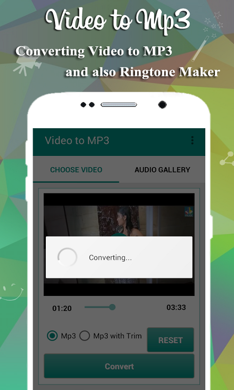 Video to MP3 app is fast and easy to convert any Video into MP3 by just few clicks. Now you can also Make Ringtone quickly using MP3 Cutter functions. ** This application is NOT Youtube MP3 converter. You can convert ONLY videos that are in your device. Easy to Convert Video to Mp3: 1) Choose Video that you want to convert in Mp3 from Phone Gallery.. 2) Choose only Video to Mp3 or Video to Mp3 with Trim (RingtoneMaker) 3) Press Start Converting Button. 4) Play mp3 in Apps Audio