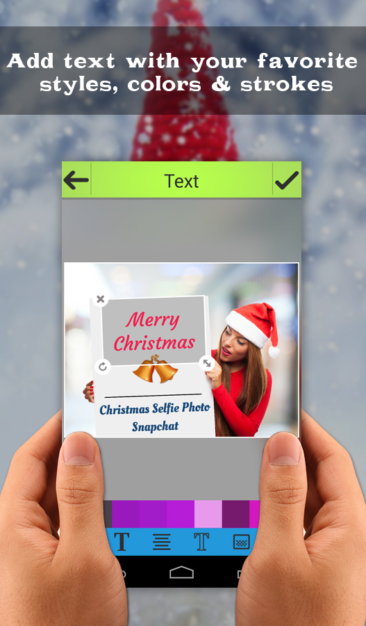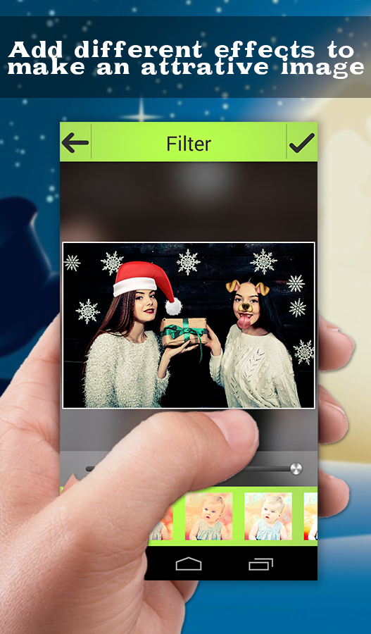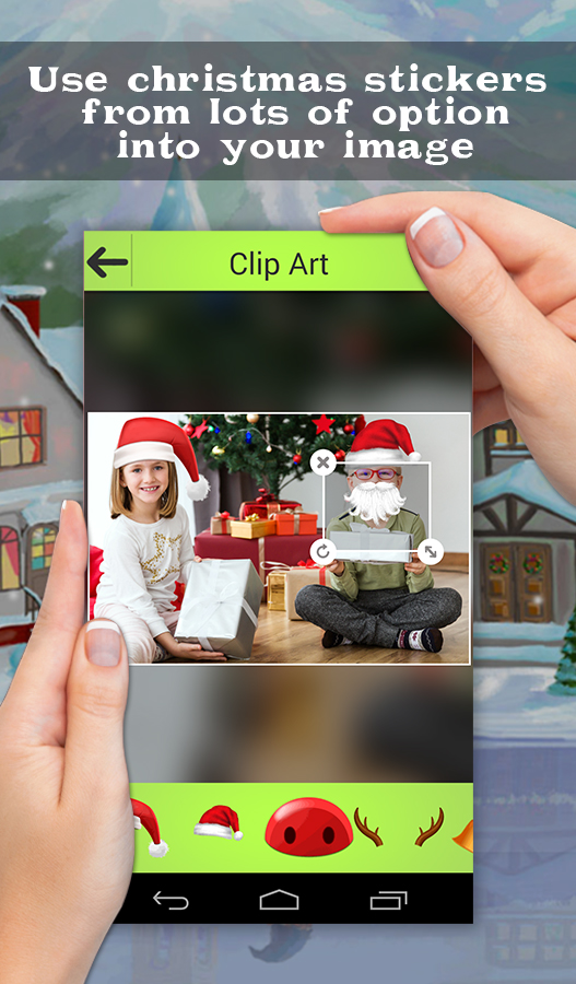 Hello Friends, If you like creative photo editing with cool effects and filters on your photos then Christmas Selfie Photo Snapchat is a perfect app for you. With this Christmas app, you can put your photo into another photo with special Christmas effects as you want. It's very easy to use, just take a photo with your camera or select an image from your phone gallery. Then write text to your photo using different fonts. Add clip art and filter to your image, we included tons of clip art for you