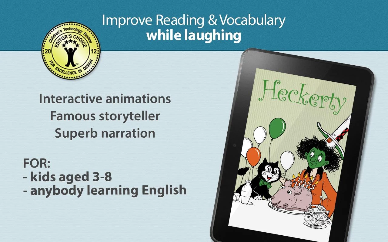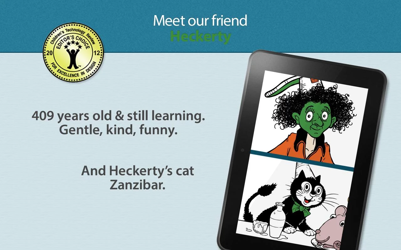 A funny family storybook for learning to read English Do you think learning can be funny? Would you like to laugh while you learn English? Meet our award-winning friend Heckerty — a 409 year old green-faced witch, hilarious and with a heart of gold. An Editor’s Choice by Children’s Technology Review, awarded “Recommended by Educators” on Google Play for Education, Shorty Awards finalist, a Mashable Kids Pick and proclaimed a “must have” by The Unofficial Apple Weblog — Heckerty delivers! The