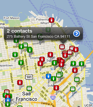 Mapulous is a very interesting and useful app which takes all of the contacts in your iPhone and displays them on a map. See Also: MapItOut (iOS) The app is complete with different colors to differentiate work contacts from home, and is capable of displaying multiple contacts at t...